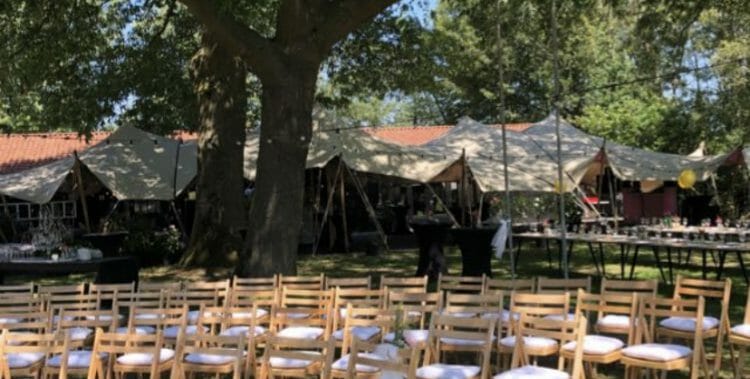 Zoveel stoeltjes, dicht naast elkaar! Maar wat kan wel, gezien de huidige Corona-maatregelen die steeds veranderen? Zolang we ons moeten houden aan 1,5 meter afstand, heb je voor besloten bijeenkomsten tot 30 personen (in juni 2020) of tot 100 personen (hopelijk vanaf juli 2020) meer tentoppervlakte nodig dan normaal.