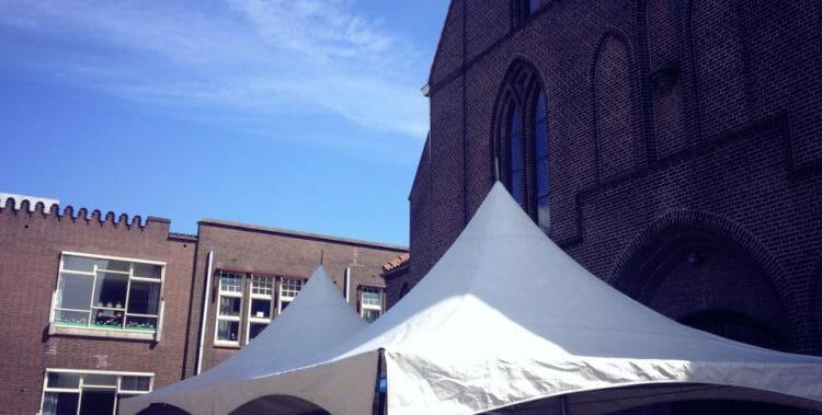 Het was een prachtige dag om twee tenten in Utrecht weer af te breken! Zonnig en droog, dan is de klus extra leuk. De tenten stonden de afgelopen dagen als entree voor een expositie in de Gertrudiskerk in Utrecht. Vierhonderd studenten van het Grafisch Lyceum Utrecht rondden daar het project “Wij zijn de wijk” af.