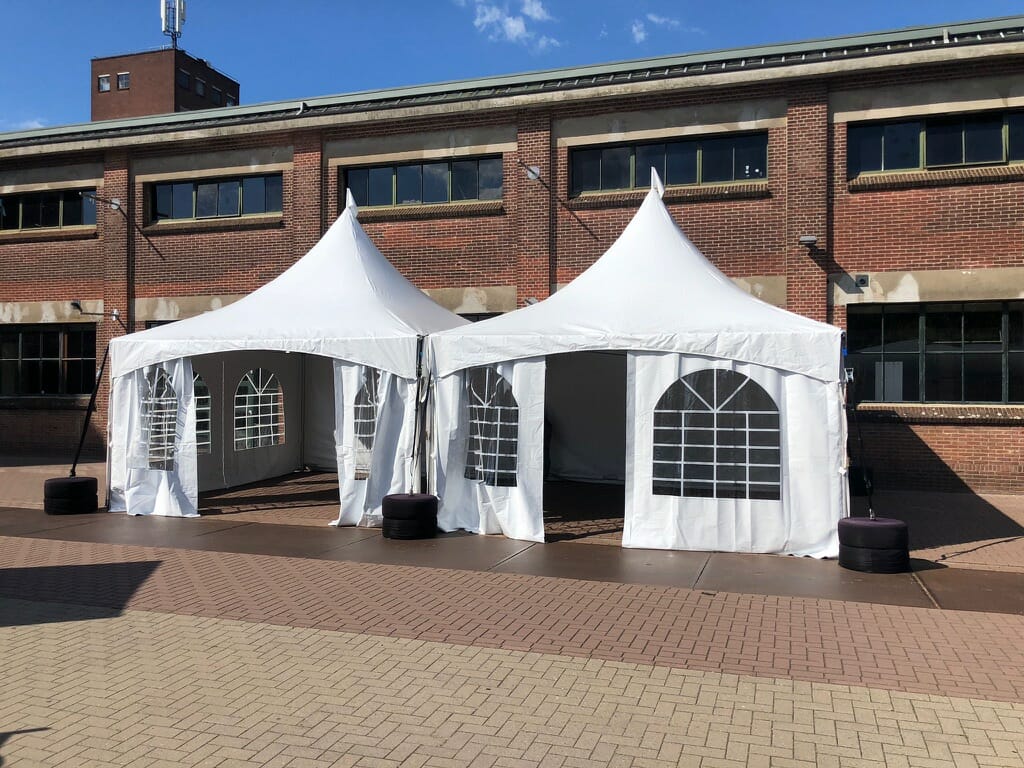 De topper onder de tenten. Een pagodetent van 6x6m, met name door zijn sierlijke, puntige dak, zorgt ervoor dat je gasten direct weten dat er iets te vieren valt of een mooi evenement te beleven is. Deze tent kan geschakeld worden aan andere pagodes, door middel van regengoten blijven je gasten dan ook droog. Zowel in een vierkant (met goot bij de vier middenpalen), naast elkaar, in een L- of U-vorm, maar net wat jouw evenement nodig heeft!