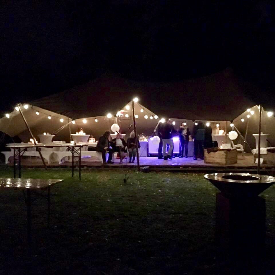 Voor extra verlichting – bijvoorbeeld aan de gevel van de tent – kunt u ook denken aan kabels met bolletjeslampen; we kunnen deze leveren met transparante en gekleurde lampen. Natuurlijk zijn kaarsen, kandelaars en windlichten ook een goede oplossing voor sfeerverlichting, bijvoorbeeld gecombineerd met lampionnen en onze statafels en slingers van Enschede Textielstad, gemaakt van reststoffen uit de productie.