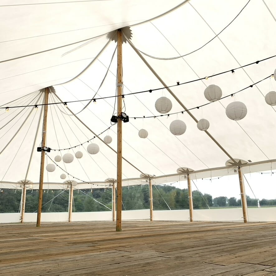 Bij de sailcloth tenten worden de kabels die in de tent hangen mooi weggewerkt in witte sleeves.