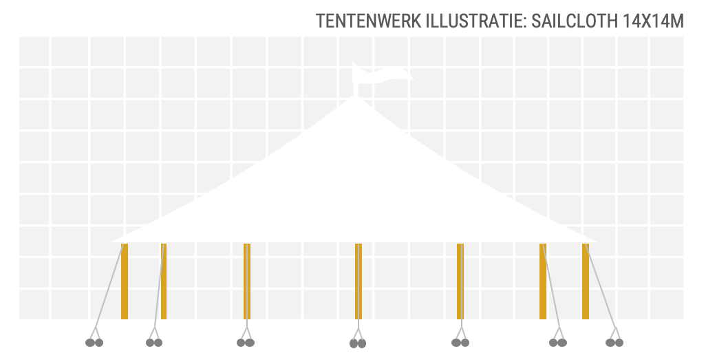 14x14m: 1 middenpaal, rond model, +/- 120 gasten (zittend), 141m2 oppervlakte, 164m2 vloer (optioneel), 14 zijwanden (optioneel)