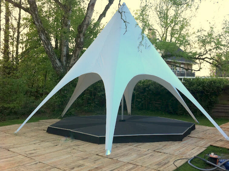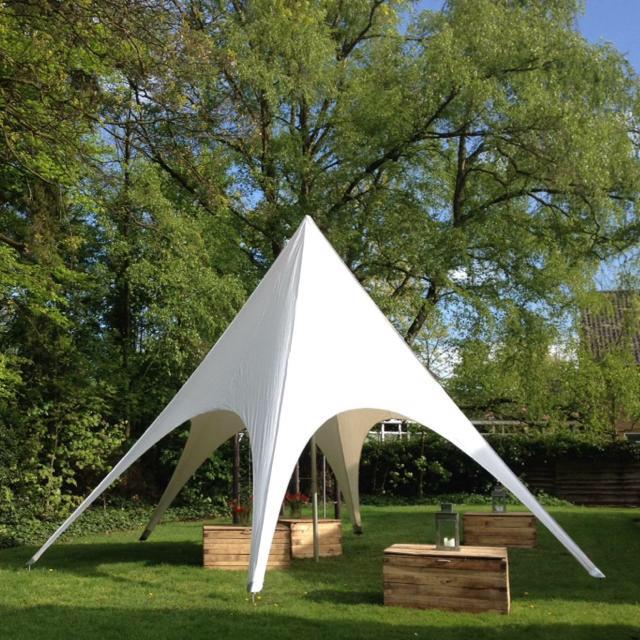 Deze tent heeft een diameter van 8 meter en zetten we supersnel op met zes grote grondpinnen.