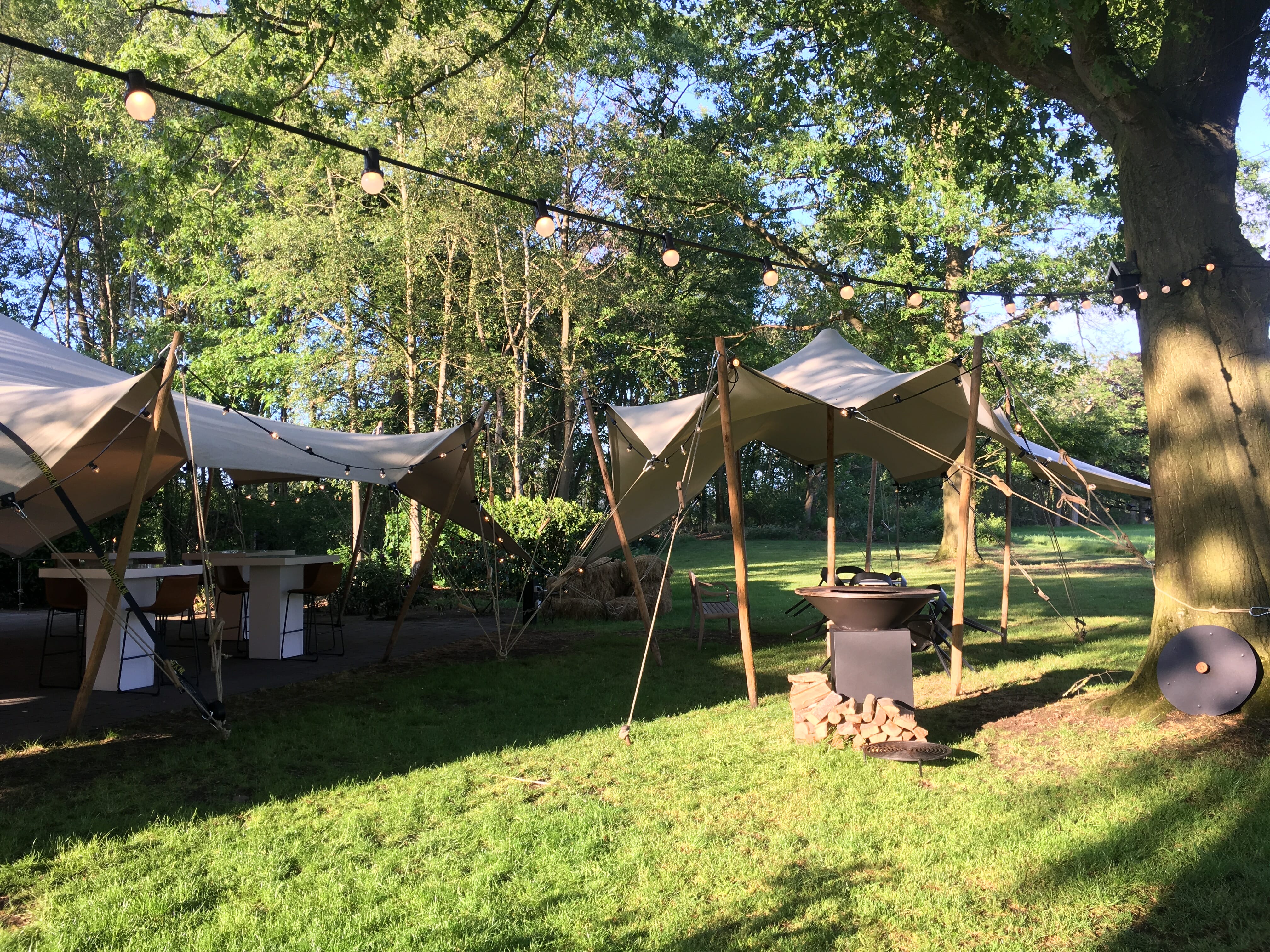 Een pracht van een tent, deze stretchtent van 5×6,5 meter. De tent is zandkleurig van buiten en crèmekleurig van binnen. De kastanjehouten palen en de scheerlijnen met eikenhout en touw geven de tent een festivalstijl. Met mooie aankleding (bijvoorbeeld met ons witte meubilair en lampionnen) kan de tent ook een chique uitstraling krijgen. Denk je ook aan een tentvloer, dansvloer, verlichting en of een podium?