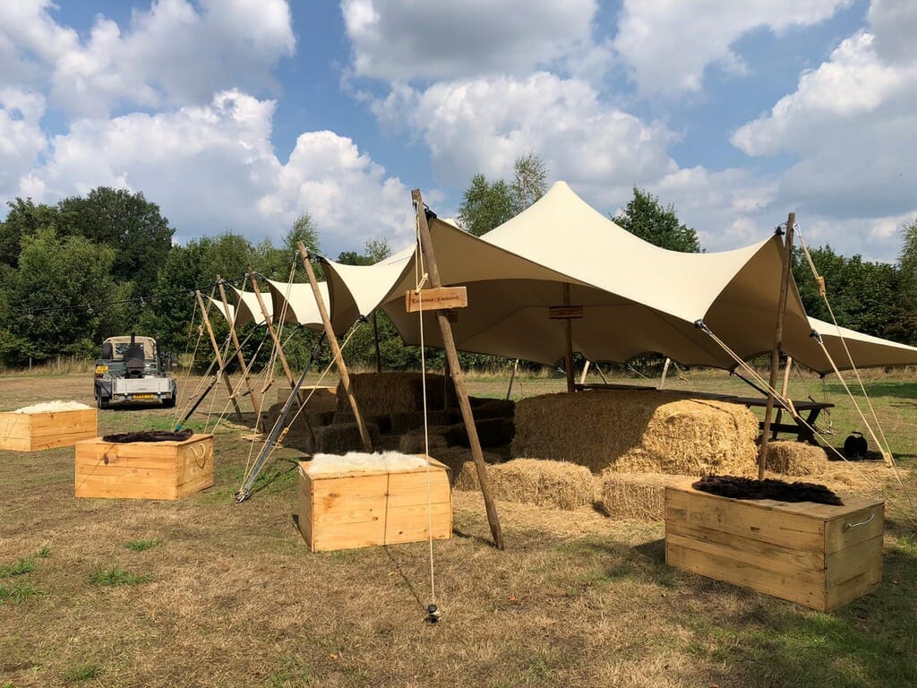 Een pracht van een tent, deze stretchtent van 7,5x12m meter. De tent is zandkleurig van buiten en crèmekleurig van binnen. De kastanjehouten palen en de scheerlijnen met eikenhout en touw geven de tent een festivalstijl. Met mooie aankleding (bijvoorbeeld met ons witte meubilair en lampionnen) kan de tent ook een chique uitstraling krijgen. Denk je ook aan een tentvloer, dansvloer, verlichting en of een podium?