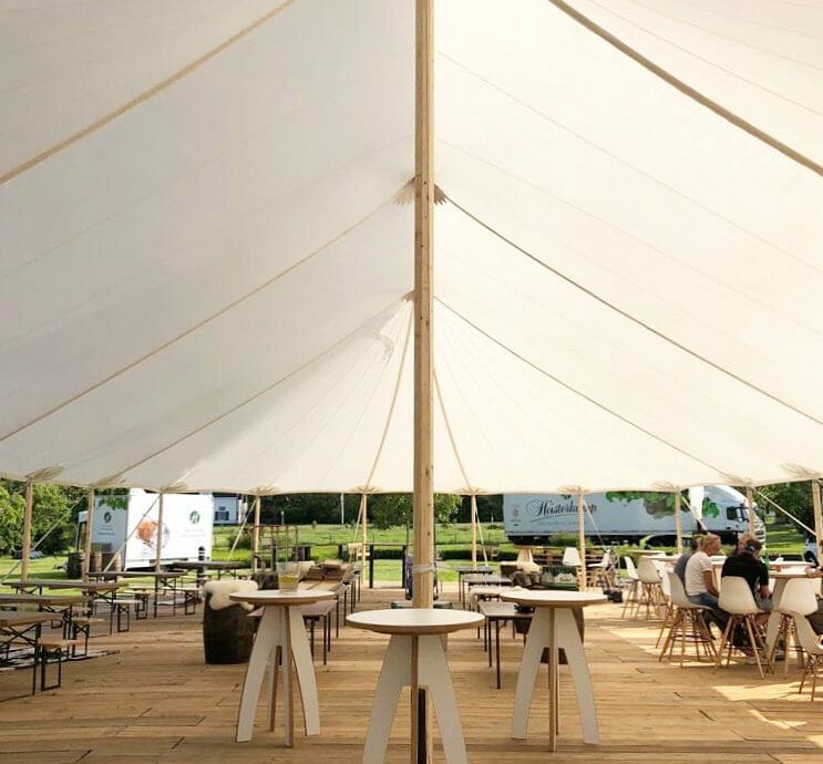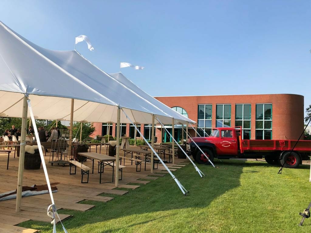 Op de foto’s die overdag genomen zijn kun je goed zien hoe lichtdoorlatend de tent is. En ’s avonds is de tent in werkelijk allerlei kleurstellingen (eventueel ook figuren?) te tonen. En: wil je geen vlaggetjes bovenop de tent? Geen probleem. Maar stiekem zijn die wel heel erg feestelijk! Tegen meerprijs met eigen bedrukking te realiseren, bijvoorbeeld met je bedrijfslogo of de initialen van het bruidspaar op de vlaggen?