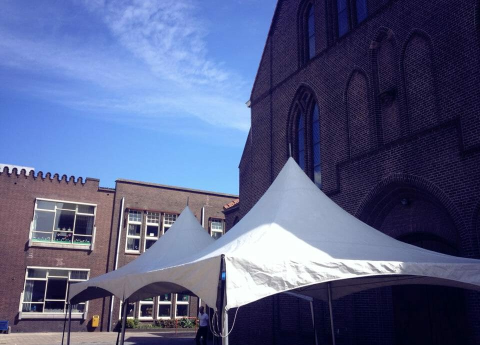 Het was een prachtige dag om twee tenten in Utrecht weer af te breken! Zonnig en droog, dan is de klus extra leuk. De tenten stonden de afgelopen dagen als entree voor een expositie in de Gertrudiskerk in Utrecht. Vierhonderd studenten van het Grafisch Lyceum Utrecht rondden daar het project “Wij zijn de wijk” af.