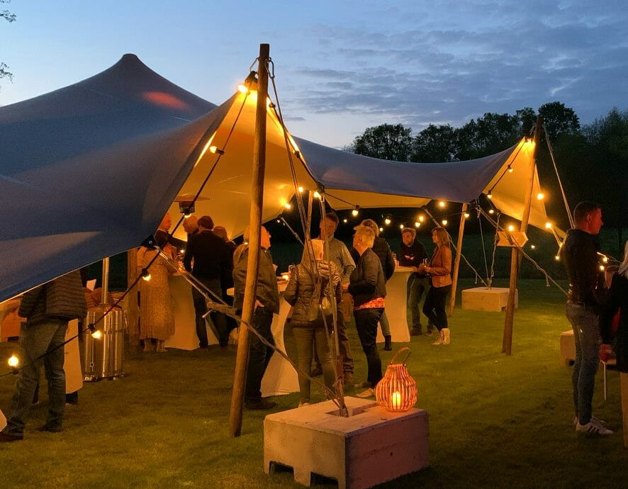 En dan nog: waar zijn je gasten? Binnen of buiten de tent, wil je een theateropstelling qua stoelen, een dineropstelling aan lange of ronde tafels of juist veel staanplaatsen en wat kleine zithoekjes?